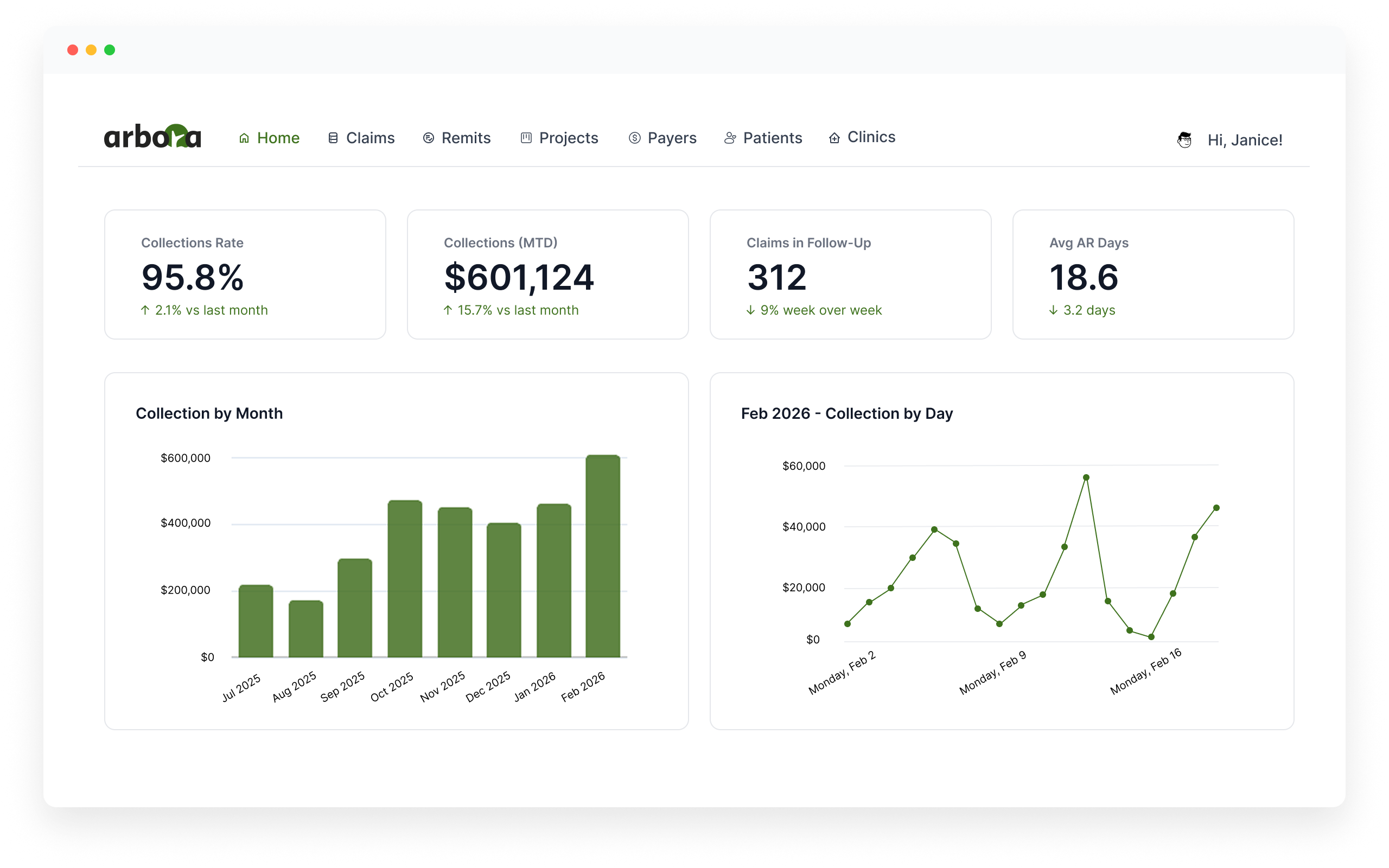 Both plansTrack your claims and revenue in real-time with Arbora's dashboard and reporting tools.